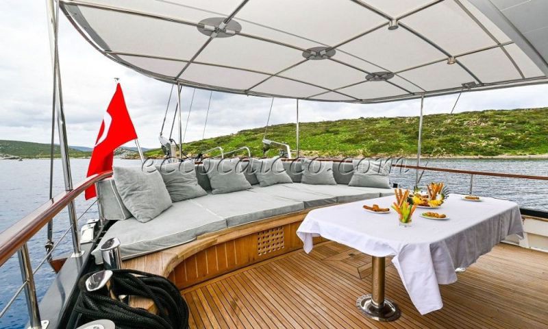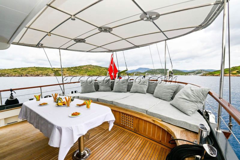 Il caicco dispone di 3 cabine (1 cabina armatoriale + 1 cabina doppia + 1 cabina twin) e proprio bagno con doccia e WC.