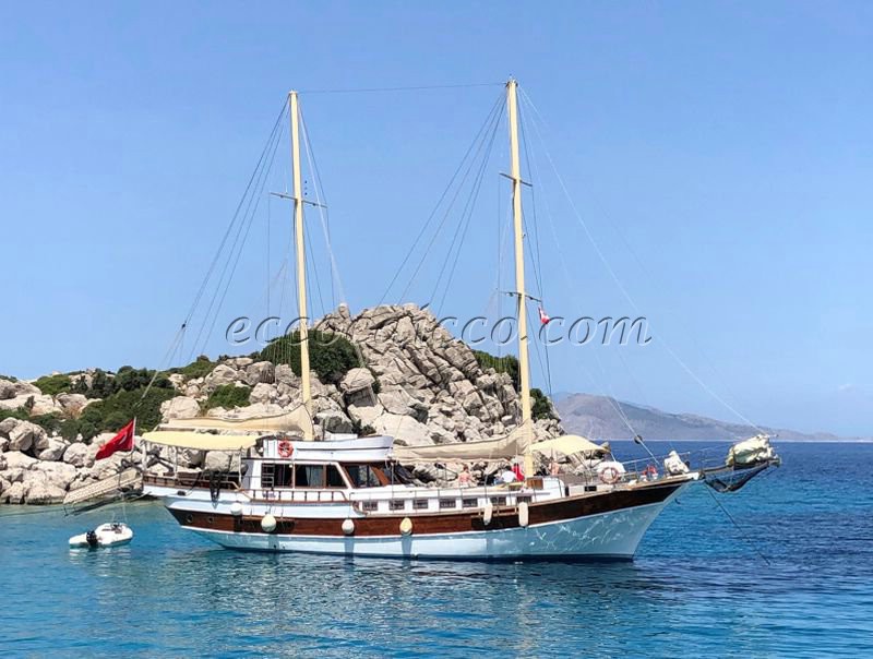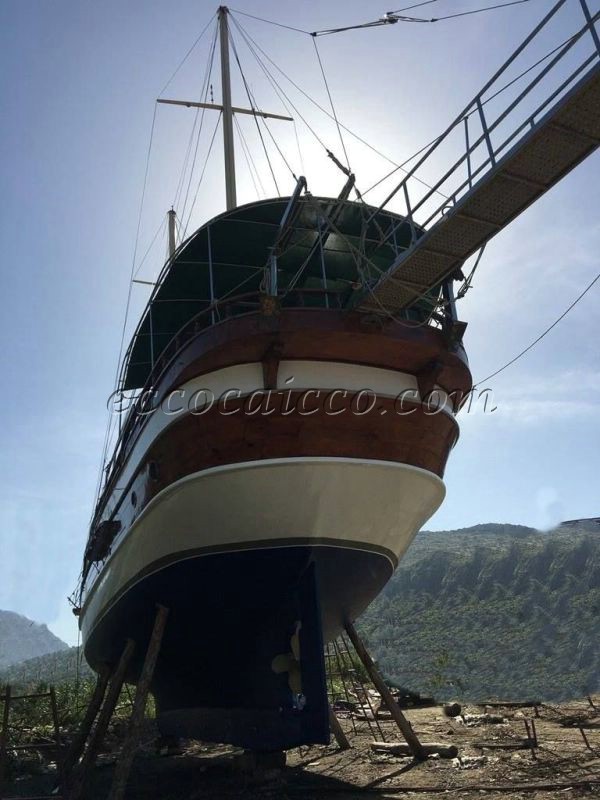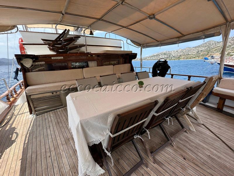 Il caicco dispone di 6 cabine (2 cabine armatoriali + 4 cabine doppie con i letti matrimoniali) e proprio bagno con box doccia e WC.