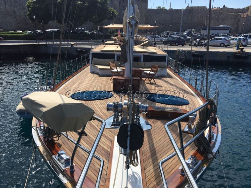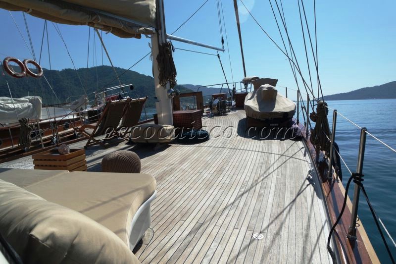 Il caicco dispone di 4 cabine (1 armatoriale + 3 doppie con letti matrimoniali) e proprio bagno con box doccia e WC. Tutte le cabine sono dotate di aria condizionata. L'equipaggio alloggia in zona separata ed indipendente. Cucina equipaggiata con freezer e forno.