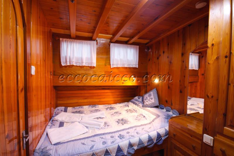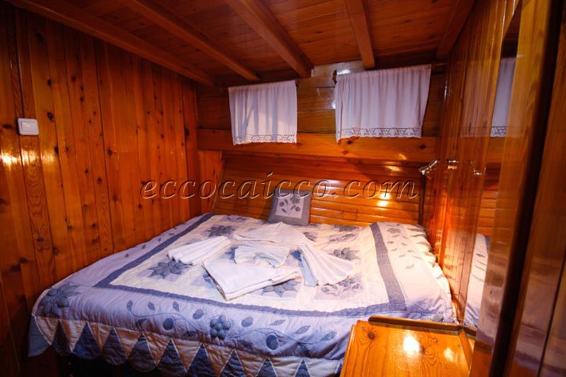 Il caicco dispone di 8 cabine doppie con letti matrimoniali + 1 cabina comandante e proprio bagno con doccia e WC.