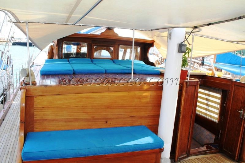 Grande living con banco bar, Zona pranzo, Grande giardinetto di poppa con tavolo, Tendalini sul giardinetto di poppa, Zattera gonfiabile per 20 pax, Giubbotti salvagente.